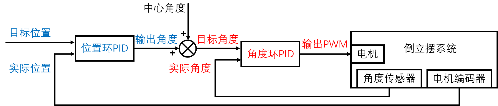 摆杆的角度靠角度传感器获取,横杆的位置靠电机编码器获取,倒立摆的首要任务是维持摆杆的倒立位置,所以内环是角度环,所以内环的实际值输入是当前摆杆的角度,而目标角度正常给的是中心角度位置,通过动态改变电机的PWM来摆杆的始终贴合设定的目标中心角度。需要注意的是位置环的输出作用于角度环时需要加一个中心角度的固定偏移。
