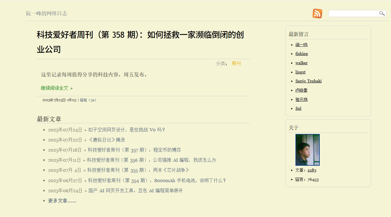 我是如何知晓阮一峰老师《科技爱好者周刊》的?虽然本人也是混开发圈的,奈何孤陋寡闻,竟然从未听说过阮一峰老师,也是在逛论坛的时候偶然听别人提起,于是赶紧去网上搜索一番,瞬间茅塞顿开。