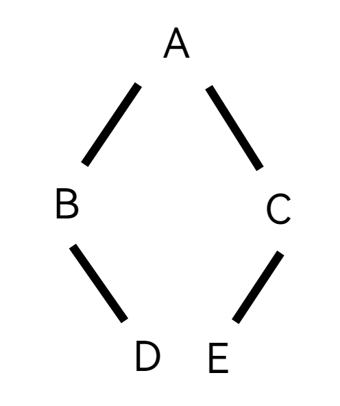 我们通过公式 根 -> 左 -> 右 可以得知这颗树的根节点应该是A,那么我们在题目上做一个标记:BDAEC,这样我们可以清晰得区分树的左子树和右子树,分别是BD和EC。继续拆开来看,由于B在先序遍历先于D出现,由于 根 -> 左 -> 右 的公式,B应该是根节点,回到中序遍历中,以B为根节点,D在B的右边,所以D就是B的右子树。同理,右边的C先出现,故C为根节点,E在C的左侧,故E为C的左子树。画出的图像是这样的