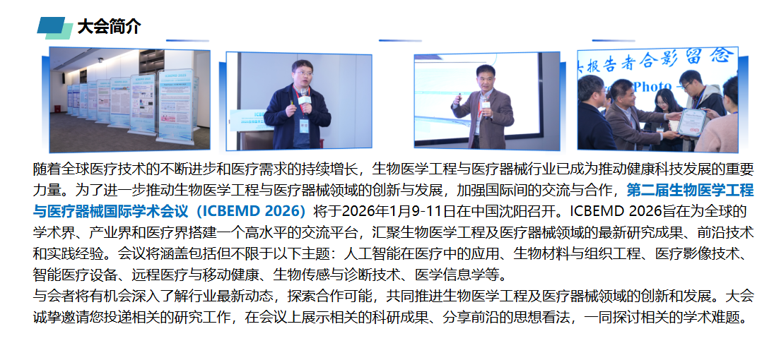 生物医学工程与医疗器械的融合创新,是提升医疗服务效率、降低诊疗成本的核心路径。从生物医学信号的精准处理,到智能医疗设备的算法研发,再到医疗数据的隐私保护,全链路技术突破正在推动医疗器械从 “辅助诊断” 向 “精准治疗”“主动健康管理” 升级。ICBEMD 2026 会议聚焦该领域的前沿研究与工程实践,为全球研究者、工程师和临床医生搭建了技术交流平台,助力生物医学工程技术更快落地临床应用,最终提升人类健康保障水平。