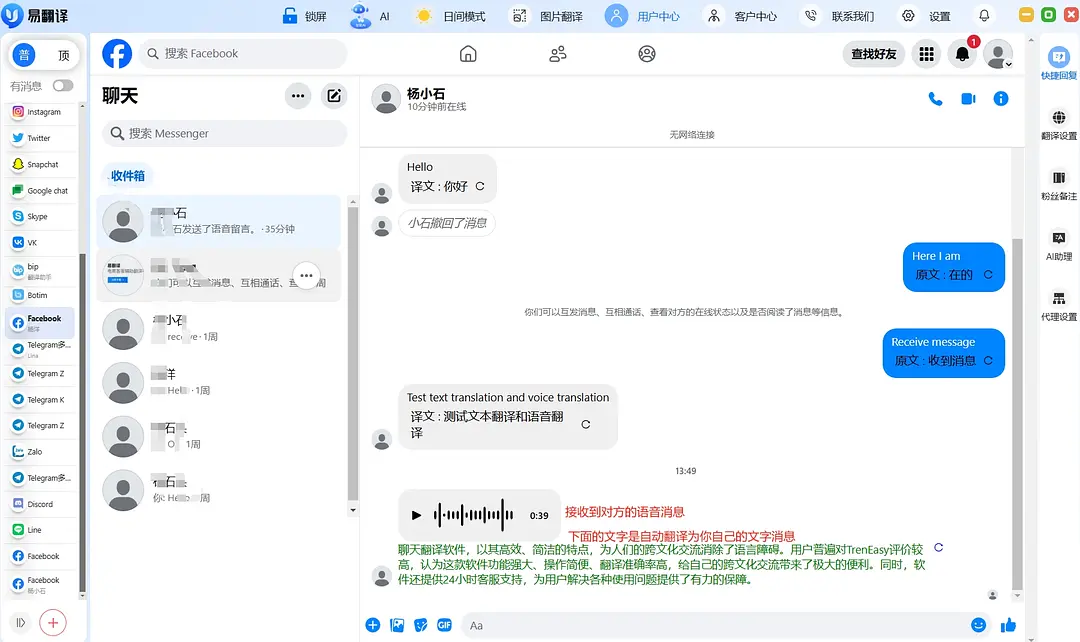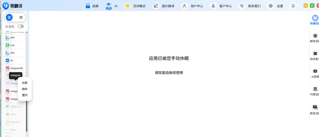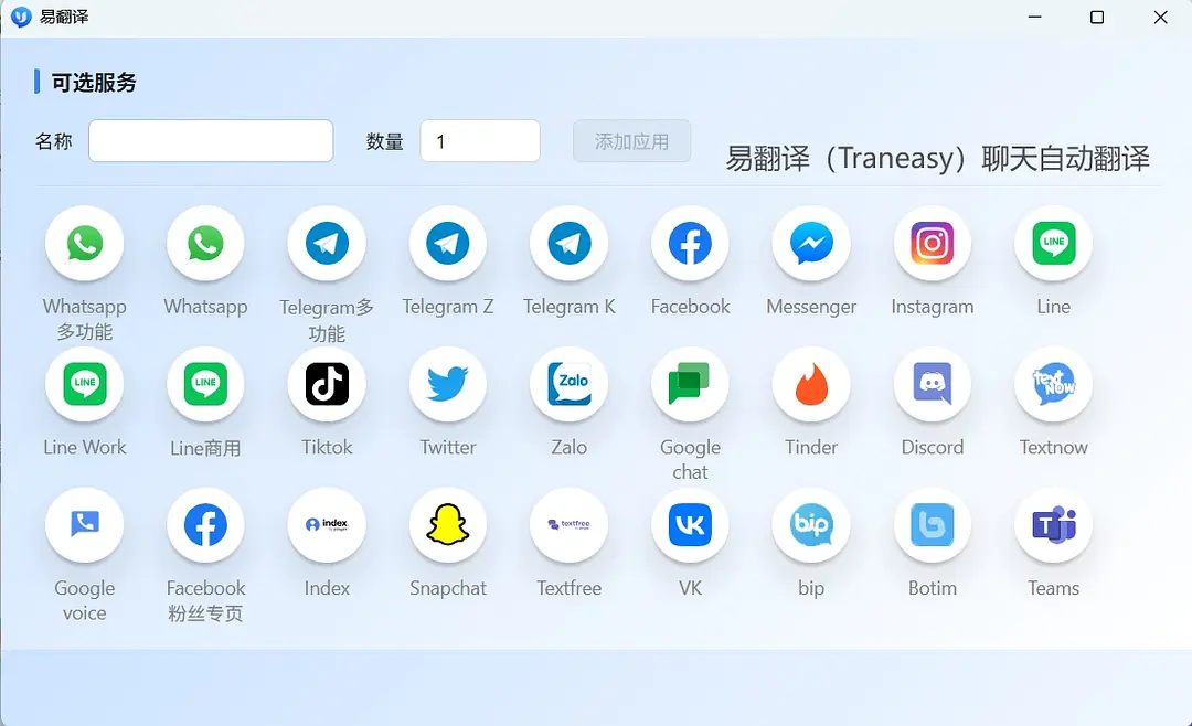 1.易翻译助手是一个支持无限多开的翻译软件,集成海外主要社交app,如WhatsApp,zalo,line,Teams,Tiktok,Instagram等社交软件的多开