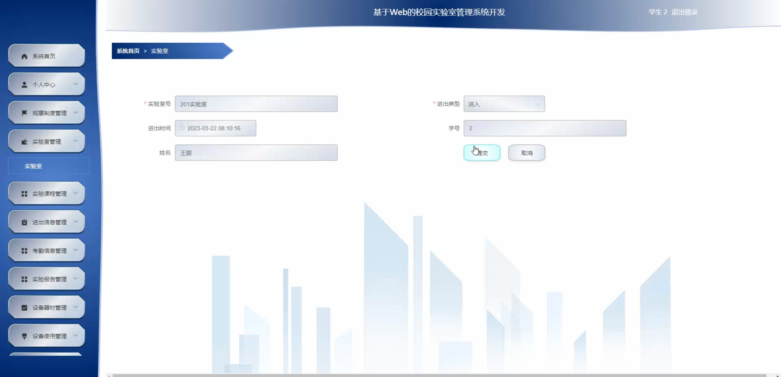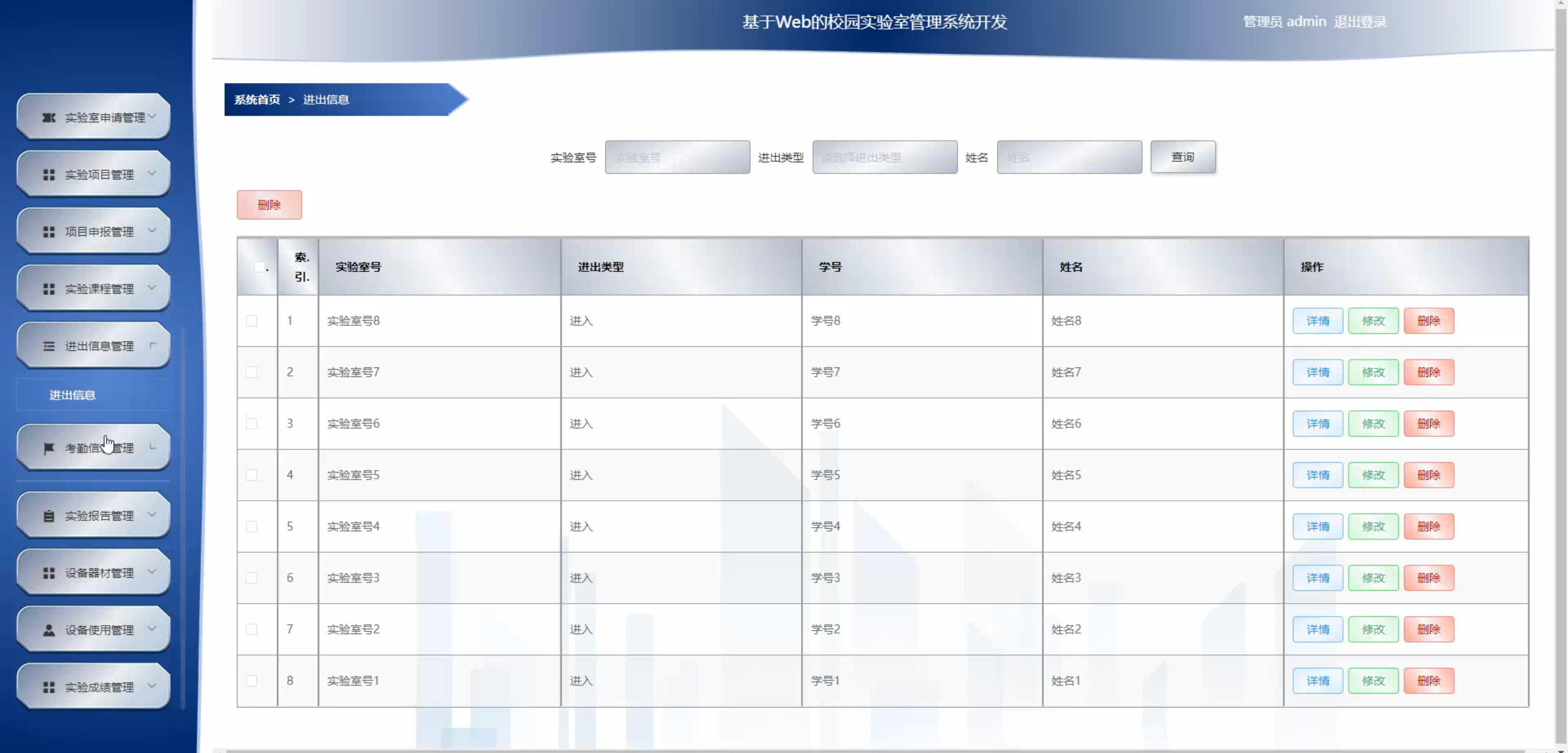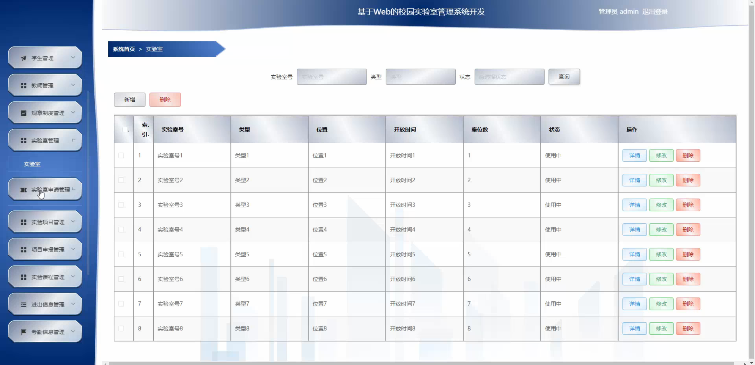 学生,教师,实验课程,实验室,实验室申请,实验室人员,设备器材,设备使用,实验报告,规章制度,实验项目,项目申报,进出信息,考勤信息,实验成绩