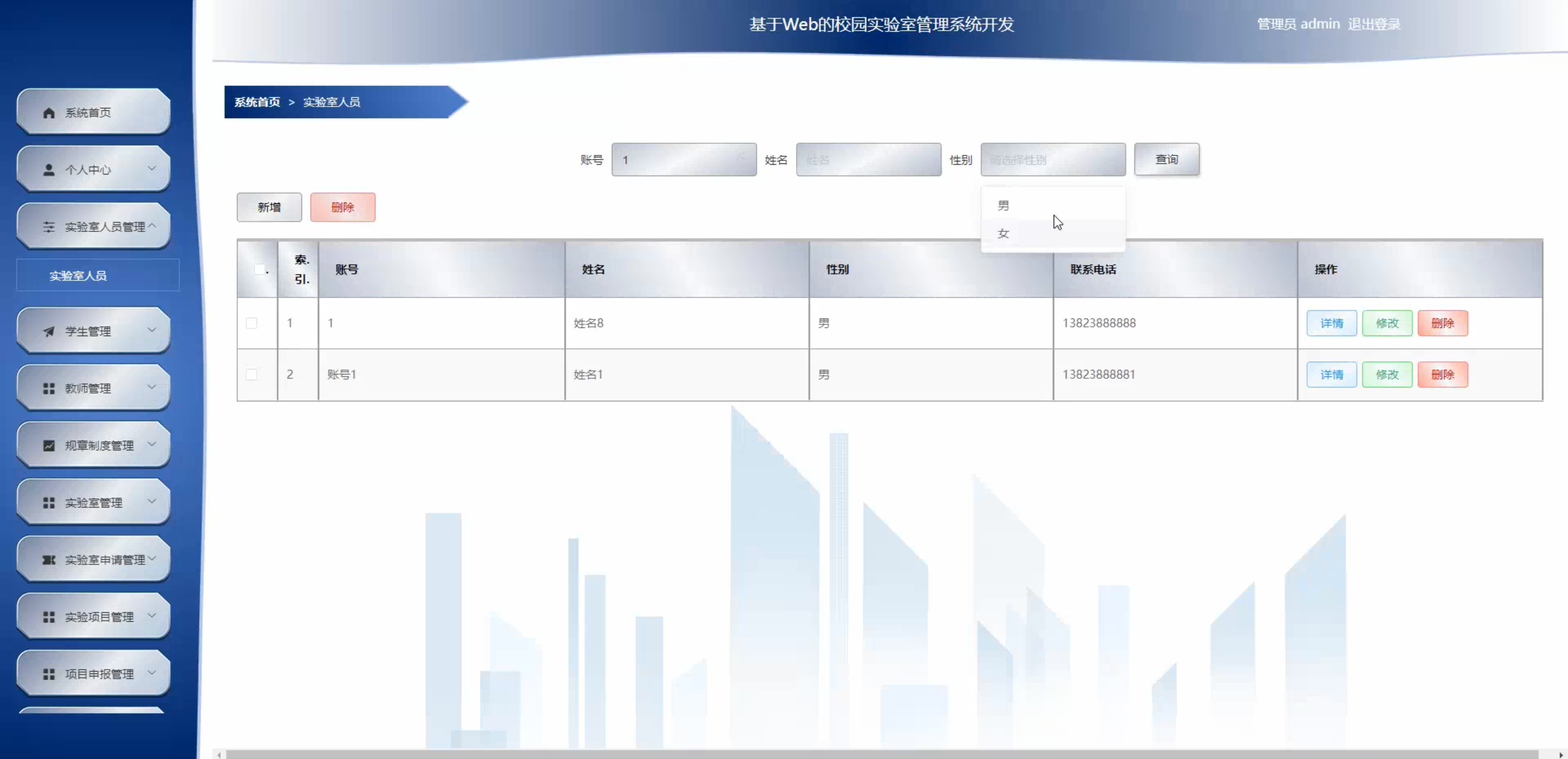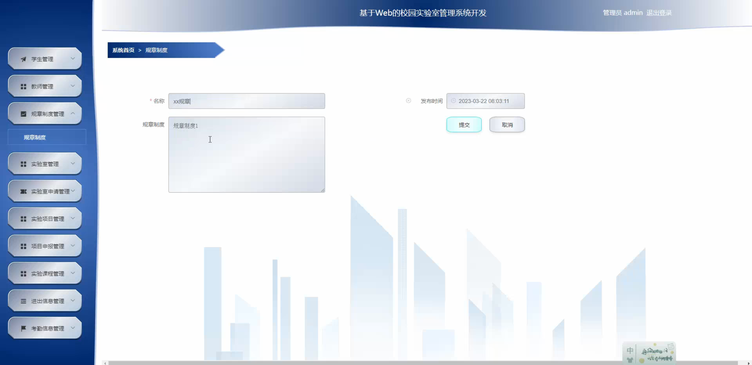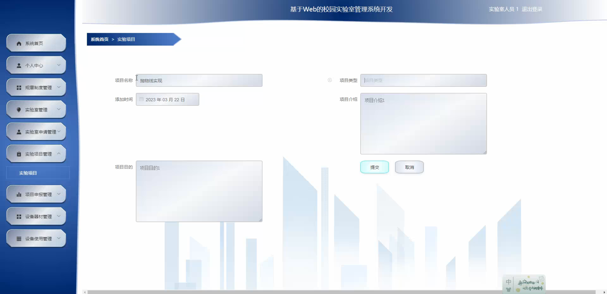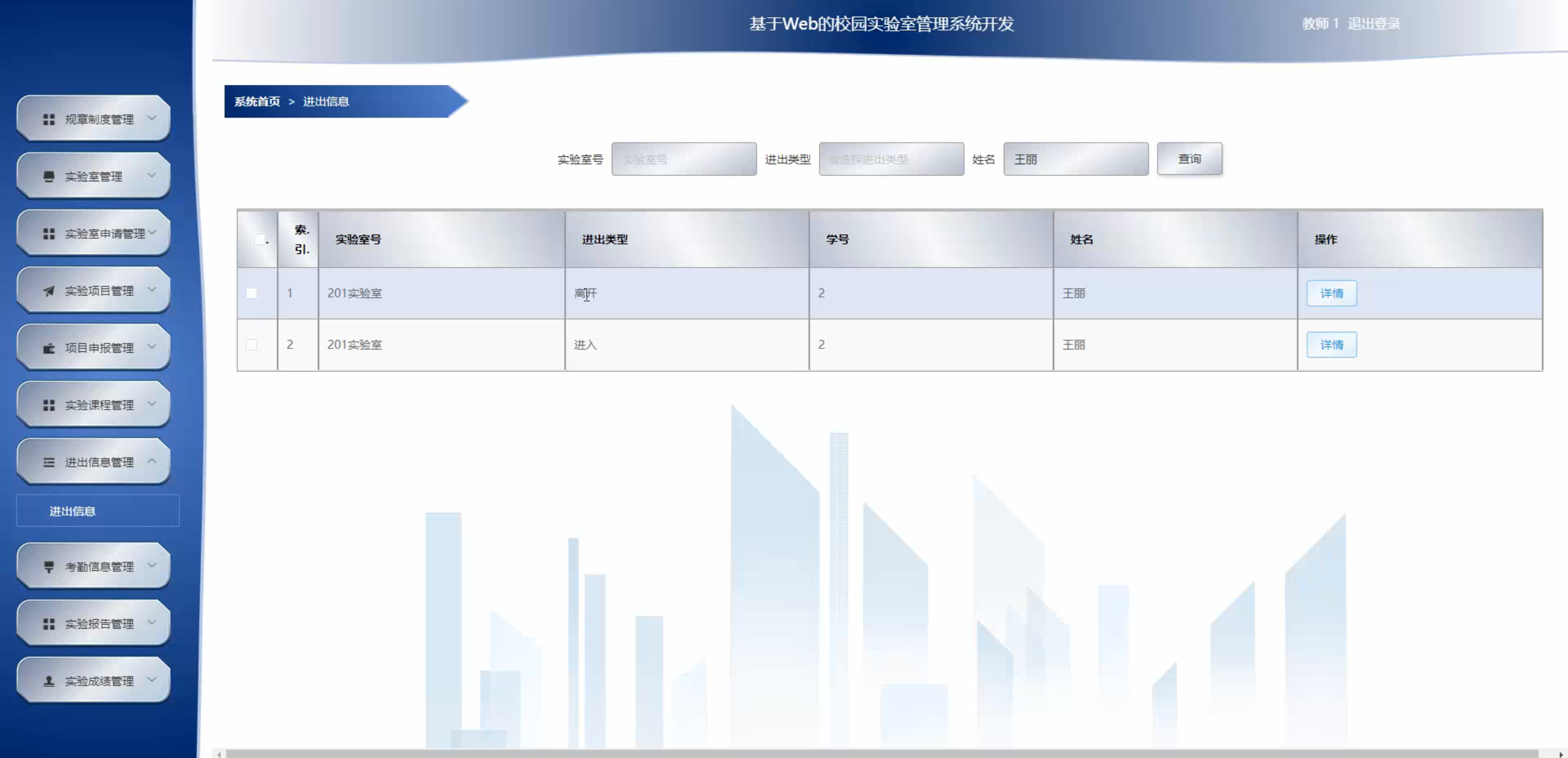 学生,教师,实验课程,实验室,实验室申请,实验室人员,设备器材,设备使用,实验报告,规章制度,实验项目,项目申报,进出信息,考勤信息,实验成绩