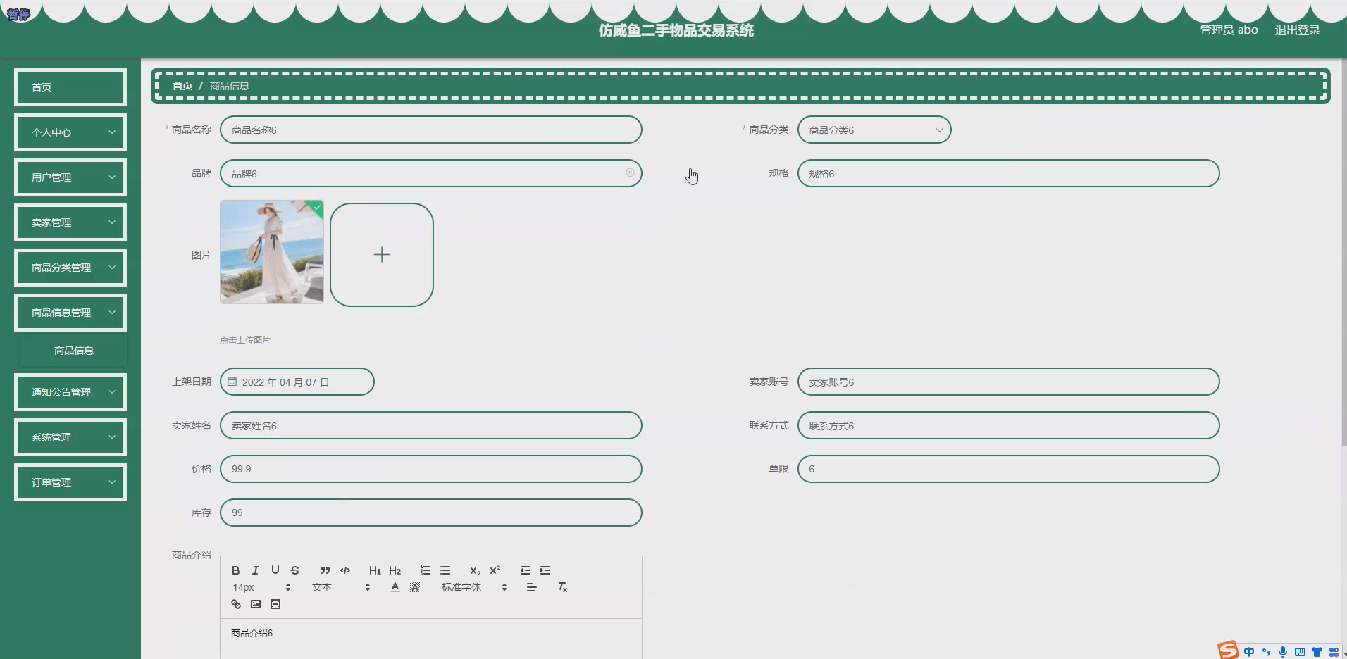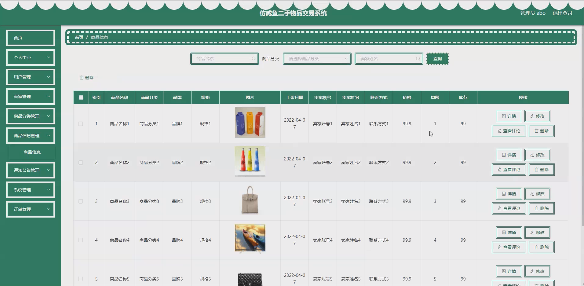 - 商品信息模块:实现商品信息的发布(卖家提交商品信息,系统自动生成商品编号)、审核(管理员审核商品信息,判断是否符合平台规则,审核通过后商品上线展示)、展示(前端按商品分类、销量、价格等维度展示商品列表,商品详情页展示商品图片、名称、价格、描述、卖家信息、库存等)、搜索(支持按商品名称、关键词搜索,实现模糊查询,支持搜索结果排序)等功能。