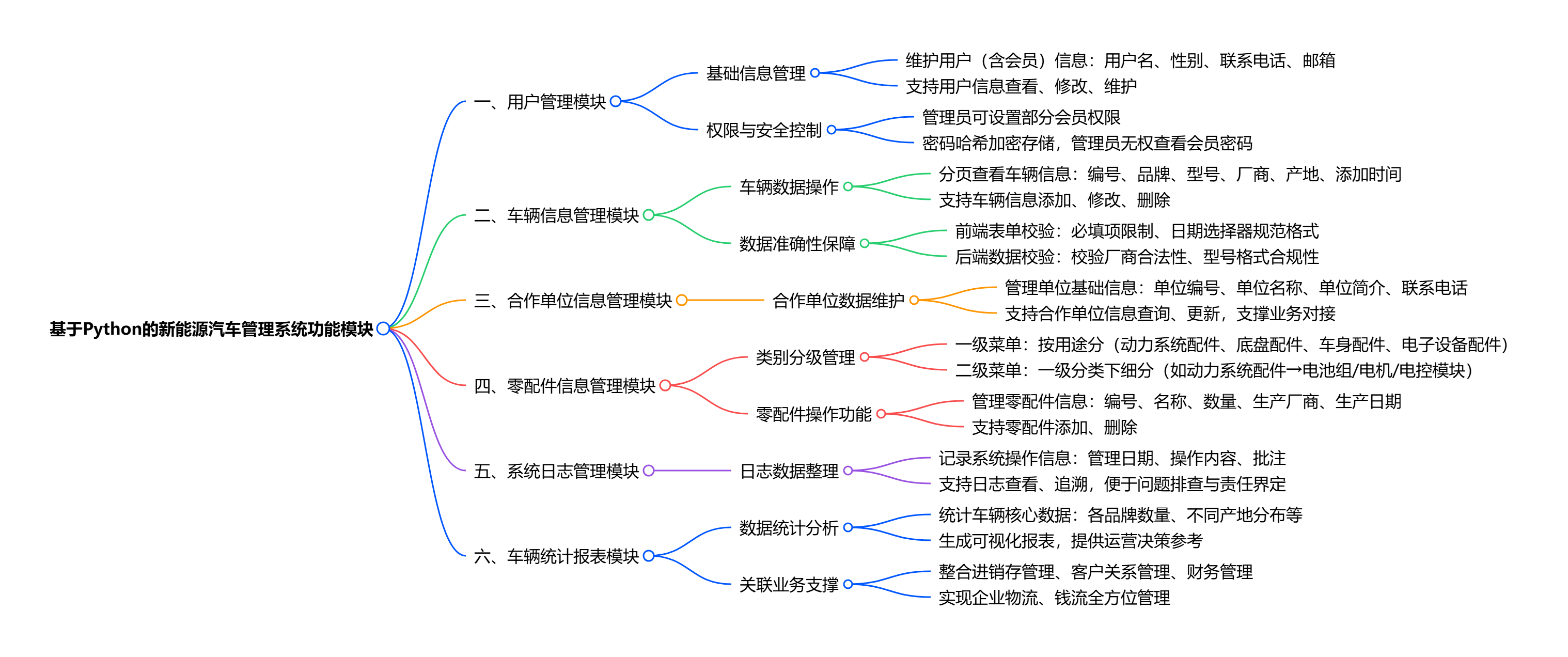 各位老师好,我是H同学,课题是《基于Python的新能源汽车管理系统的设计与实现》。系统采用 B/S 架构:前端 Vue3+ElementPlus,后端 Flask+MySQL8,ORM 用 SQLAlchemy;核心功能包括用户/会员管理、车辆档案、零配件库存、合作单位、系统日志与统计报表六大模块。车辆档案支持图片上传与批量导入,库存支持预警阈值,报表用 ECharts 实现销量、维修频次、配件周转率可视化。后台用 Flask-Login 做权限分级,日志统一记录操作轨迹,保证数据可审计。下面请各位老师提问。