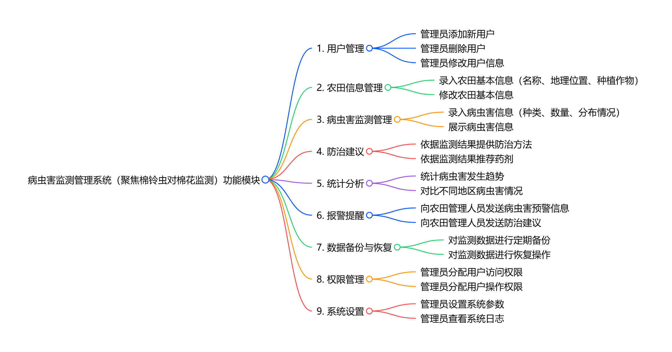 该病虫害监测管理系统(聚焦棉铃虫对棉花的监测管理)核心功能可概括为:涵盖 9 大核心模块,包括支持管理员进行用户添加、删除及信息修改的用户管理,农田名称、地理位置等基础信息录入与修改的农田信息管理,记录病虫害种类、数量、分布情况的病虫害监测管理;