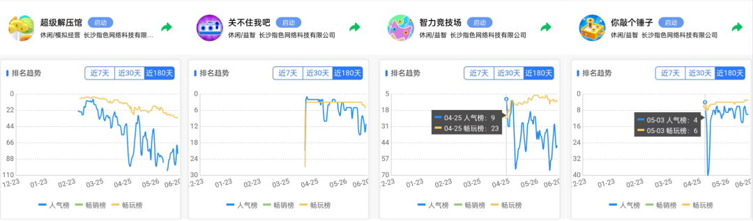 经此之役,长沙指色在IAA小游戏上不断复制之前的成功。随后新上线的“锤子、螺丝”系列连续3个月霸榜人气榜畅玩榜TOP10,这不活脱脱成为亿级流水的商厂?