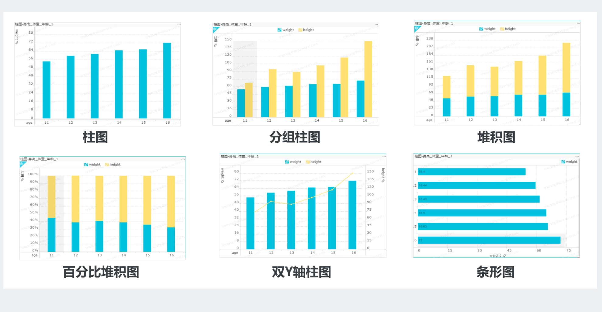 | 柱图 | 类别轴,值轴 | 类别轴至少1个维度;值轴至少1个维度 |