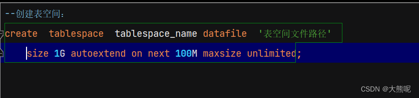 size 1G:指定表空间文件的初始大小,大小单位可以是G、M、K等