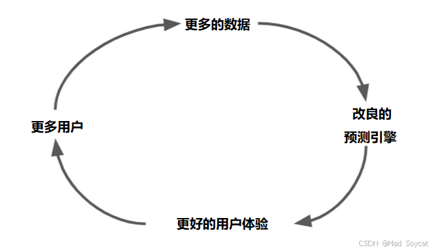 一开始,使用的是非常简单的启发式或基于规则的算法(例如,显示10部最受欢迎的电影),通常对所有用户的推荐都是相同的。这意味着你今天不必是最好的或最强大的,只要比你的竞争对手更快地学习并将新知识纳入改进你的产品、服务和内部流程中。我们有责任弄清楚他们是谁以及我们的工作如何融入他们的生活,否则数字只是数字,真正重要的是我们对这些数字做了什么。其次是数据支配力,这对应于之前的例子,其中一家公司在其行业中成功激活了数据的良性循环,数据的持续流动每天都能推动产品的快速改进,使其他公司更难竞争。