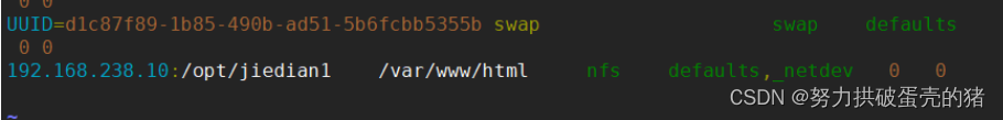192.168.238.10:/opt/jiedian1 /var/www/html nfs defaults,_netdev 0 0