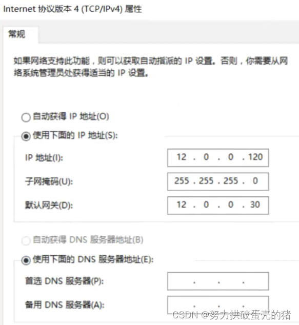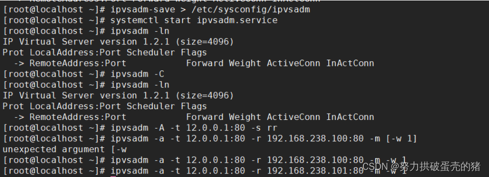 ipvsadm -a -t 12.0.0.1:80 -r 192.168.238.100:80 -m -w 1 -a添加真实服务器 -r指定RIP地址和端口 -m使用NAT群集模式 [-w 1]指定权重
