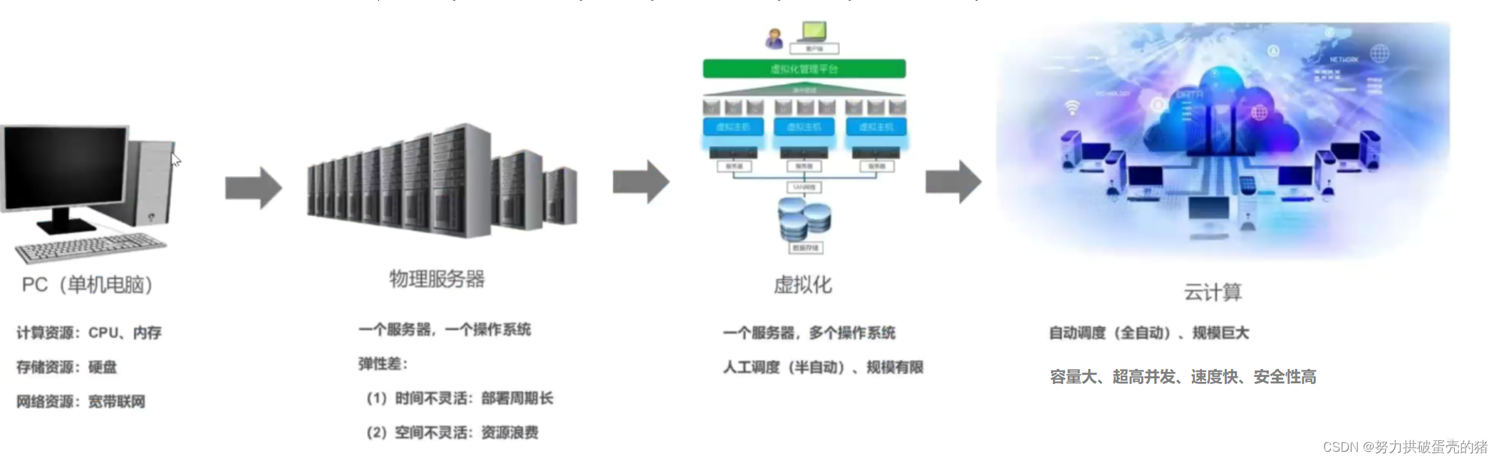 - 高性能依赖于“分布式运算”、 "并行计算” ,通过专用硬件和软件将多个服务器的CPU、内存等资源整合在一-起, 实现只有大型、超级计算机才具备的计算能力。例如,"云计算”"网格计算”等