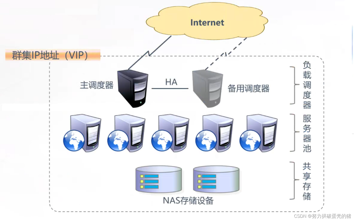 访问整个群集系统的唯一入口, 对外使用所有服务器共有的VIP地址,也称为群集