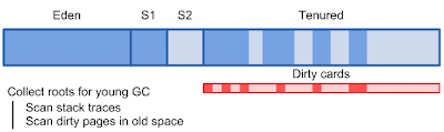 Almost all new objects (there are few exception when new object can be allocated directly in old space) are allocated in Eden space. To be more effective HotSpot is using thread local allocation blocks (TLAB) for allocation of new objects, but TLAB themselves are allocated in Eden. Once Eden becomes full minor GC is triggered. Goal of minor GC is to clear fresh garbage in Eden space. Copy-collection algorithm is used (live objects are copied to another space, and then whole space is marked as free memory). But before start collecting live objects, JVM should find all root references. Root references for minor GC are references from stack and all references from old space.