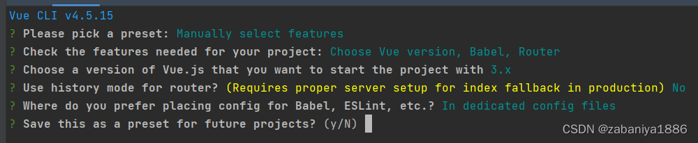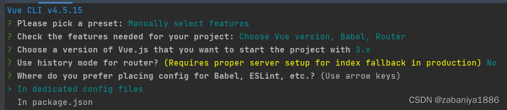 在这个界面中,vue-cli 是在询问你:是将所有的配置都放在 pacakge.json 一个文件中,还是将各个功能的配置分开存放在独立的文件中?