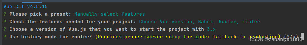 在这个界面中,vue-cli 在询问你,对于 Router 你是否以它的 history 模式使用它?默认值是 Yes 。