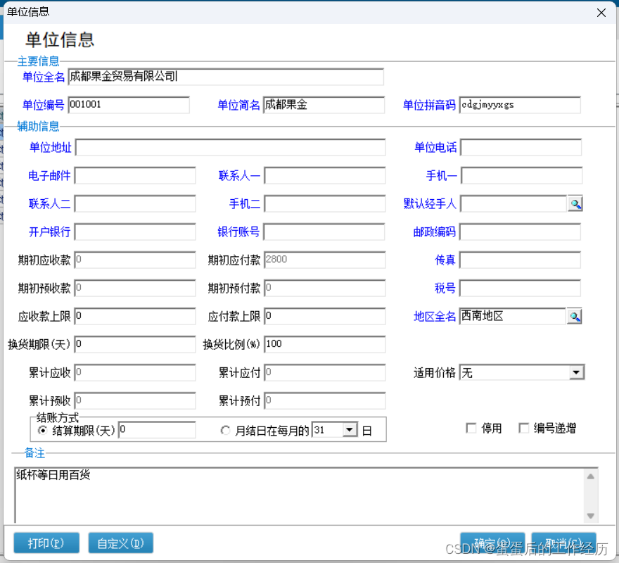 2、单位信息:添加供货商和客户的公司名称等信息。