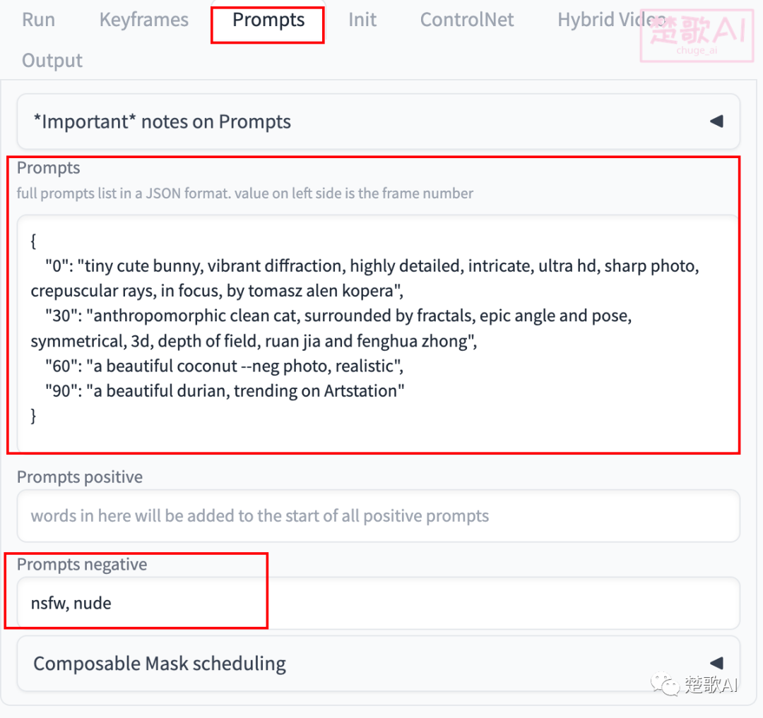 同样是用Json格式来控制,从哪一帧开始,使用什么提示词,如上图所示,0-29帧,30-59帧,60-89帧和90帧以后,分别使用4种不同的提示词。从而实现视频的渐变效果。