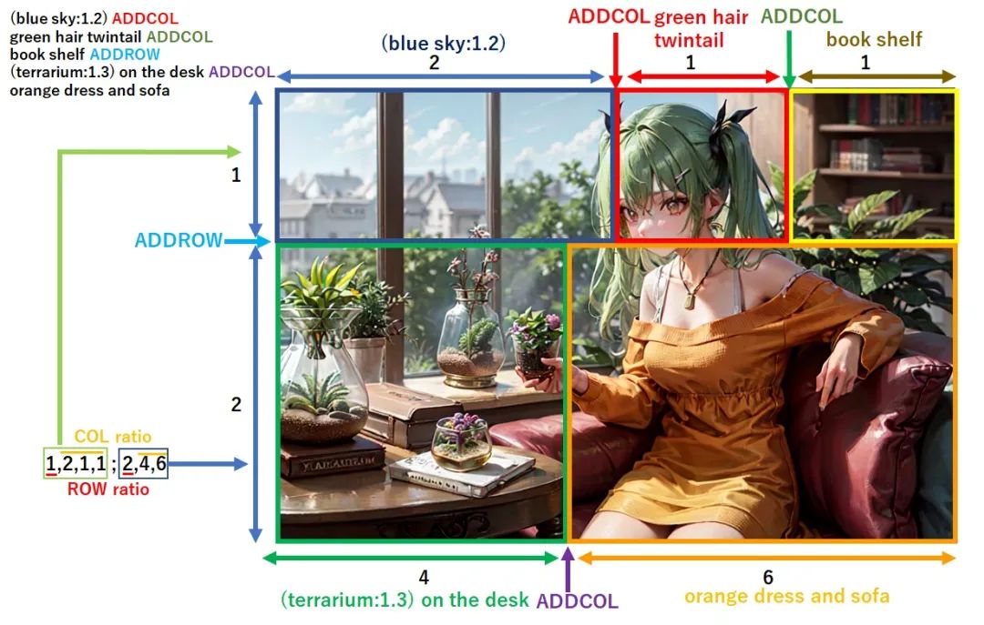 区域提示器允许我们将图像分成几个部分并为每个部分设置独特的提示词。提供了极大的灵活性:比如可以准确定位对象并为图像的某些部分选择特定颜色,而无需更改其余部分。