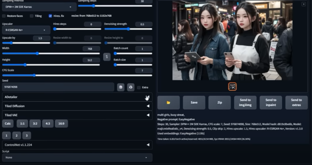 现在我们只需要在出图的时候启动 Adetailer 就可以很大程度上修复脸部和手部的崩坏问题