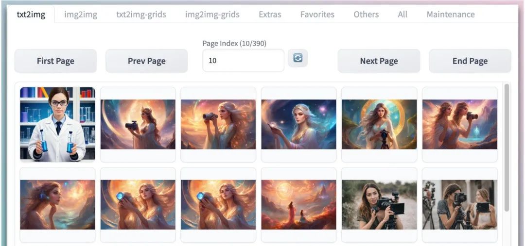 Stable Diffusion 默认不支持通过在页面上查看历史出图的记录,想要查看历史图片,只能在电脑文件夹里面慢慢找。