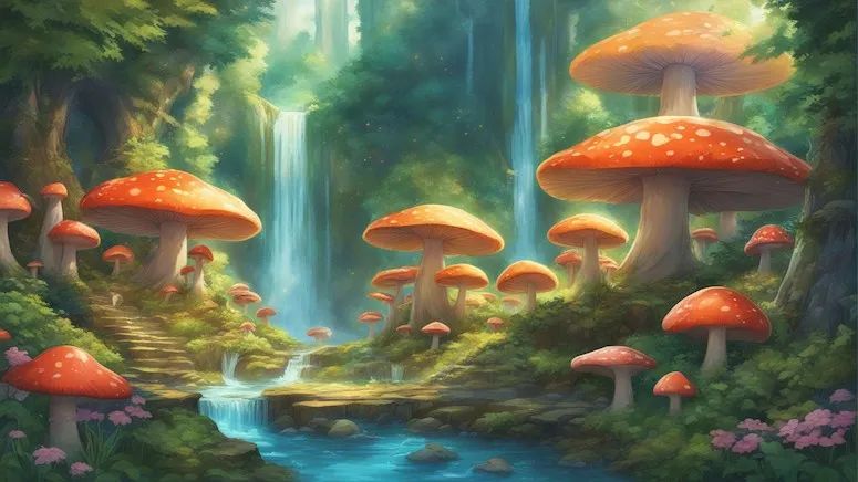 提示#4:瀑布隐藏在茂密的魔法森林中,周围环绕着生机勃勃的超大蘑菇