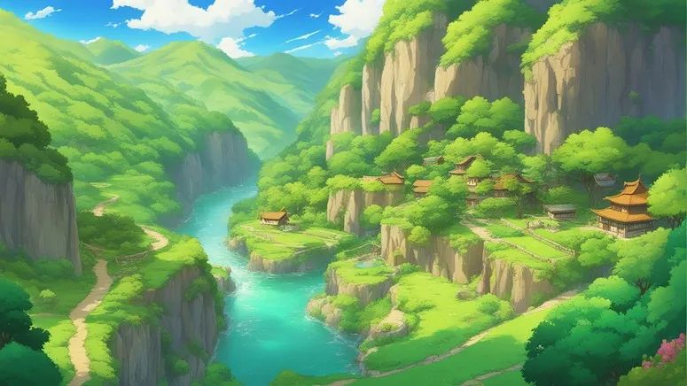 提示#5:隐藏的山谷坐落在高耸的悬崖之间,一条清澈的河流蜿蜒穿过郁郁葱葱的翠绿草地,零星的居住着几户人家。