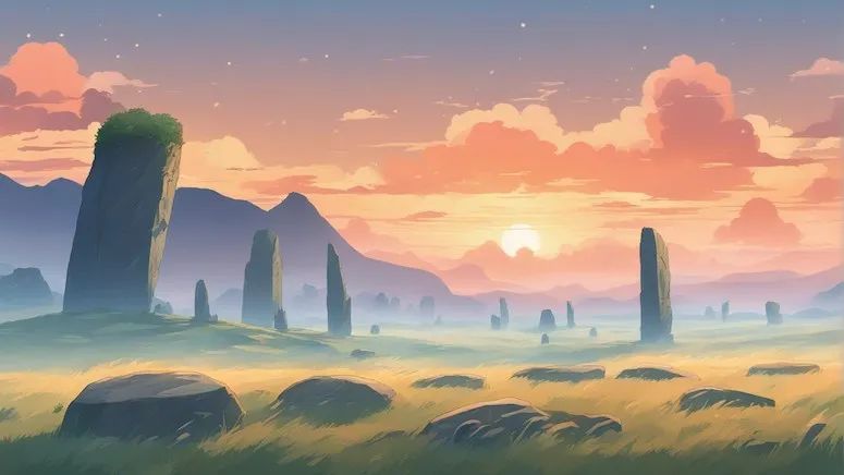 黎明时分,宁静的荒野被柔和的雾气笼罩,古老的石圈和孤立的石柱仿佛是岁月的见证。在这静寂的时刻,大地沉浸在神秘的氛围中,仿佛隐藏着无尽的故事和传说,等待着被探索。