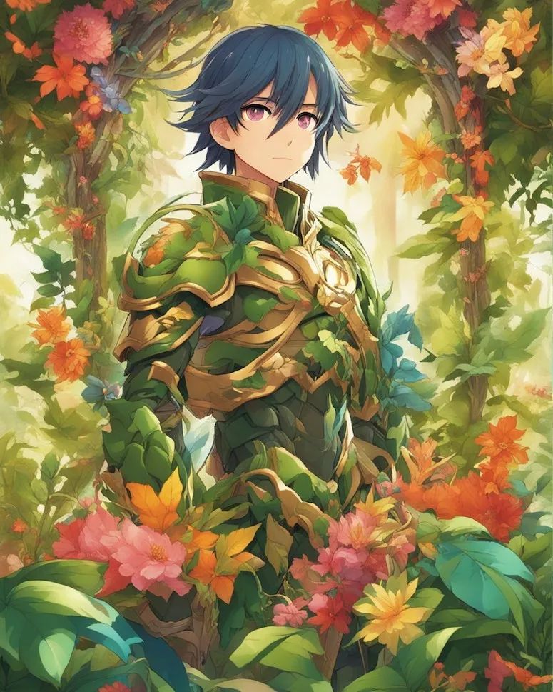 提示#1:角色被茂密的植物群覆盖,藤蔓和树叶看起来像天然的魔法盔甲