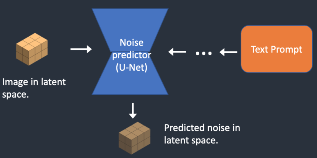 - 第三步 噪声预测器将上一步处理后的潜空间图像与文字指令作为输入传入其U-Net网络,并给出预测应减去的潜空间噪声张量。