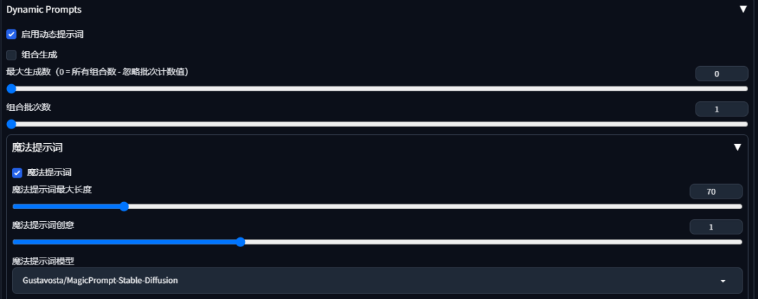 插件安装完成之后,可以看到 SD 首页多了一个 Dynamic Prompts 的标签,打开之后发现默认状态就是启用的。