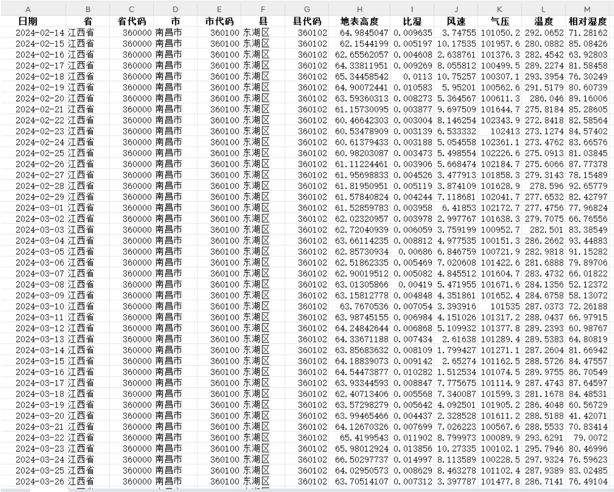 省市区县气温气压风速湿度等气象数据1980-2024年