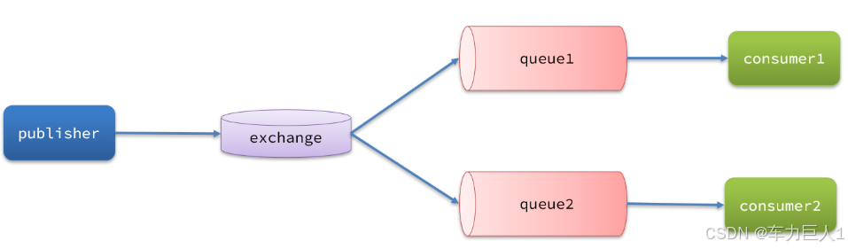 publisher生产者将消息发送到exchange交换机,再由exchange路由到指定的queue队列。