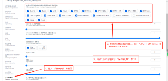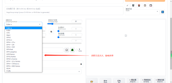 从上图中可见采样方法列表有很多,而现阶段我们一般用得比较多的主要是DPM++ 2M Karras和DPM++ 2M Karras,这两个是经过优化后的算法,出图速度会快些。