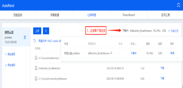 这里为什么要让大家先把模型下载下来再转存到阿里云盘上去呢?因为AutoDL可以支持直接从阿里云盘上把模型文件下载到我们的云电脑里面,下载进度可见,体验要好些。