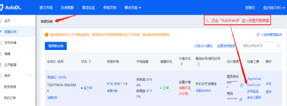 首先切换回AutoDL的“容器实例”管理界面: