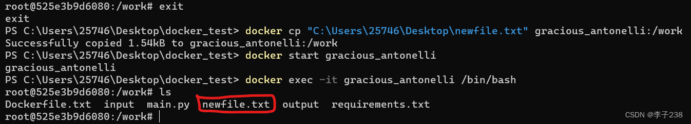 其中容器ID或容器名可通过docker ps -a(查看所有容器)查看,或借助DockerDesktop提供的图形界面。上图中的docker start gracious_antonelli重新启动了容器,gracious_antonelli是容器名,docker exec -it gracious_antonelli交互式进入容器。