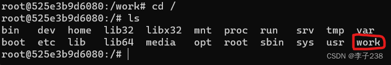 可以退到根目录看到整个文件系统全貌,其中就有我们创建的work工作目录。