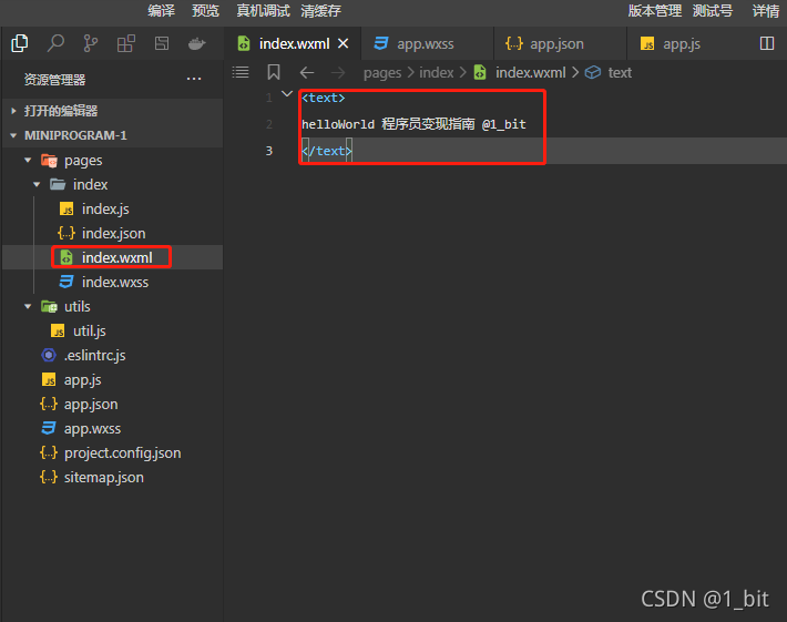 此时我们点击某一个文件查看会发现代码看不懂,例如 index.wxml文件: