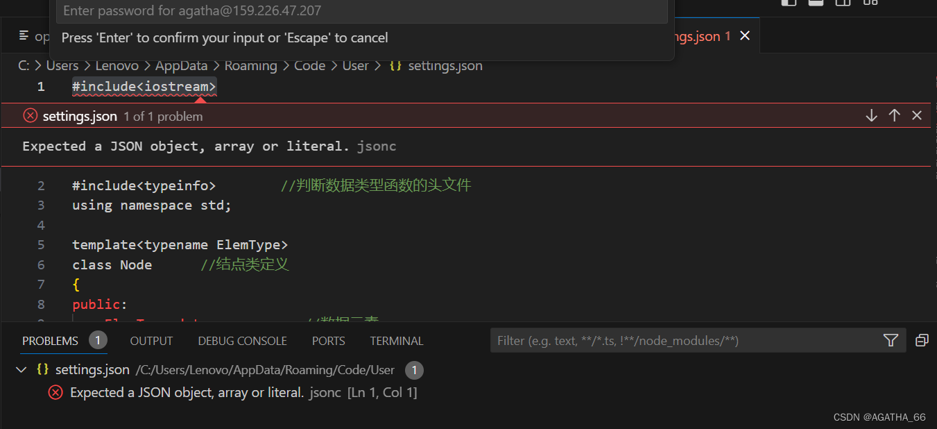 【已解决】vscode远程连接报错:Failed to write `remote.SSH.remotePlatform`: CodeExpectedError: Unable to write in vscode远程连接服务器报错Failed to write `remote.SSH.remotePlatform`: CodeExpectedError: Unable to write in。看了网上的需要该json文件,但是很奇怪的是,我从服务器kill了多的vscode-server进程之后,即便这个文件依旧标红,还是使用vscode远程连接成功了。点击报错窗口进入扩展设置,发现settings.json文件爆红。但是ssh命令可以直接连接,说明ssh服务没有问题。