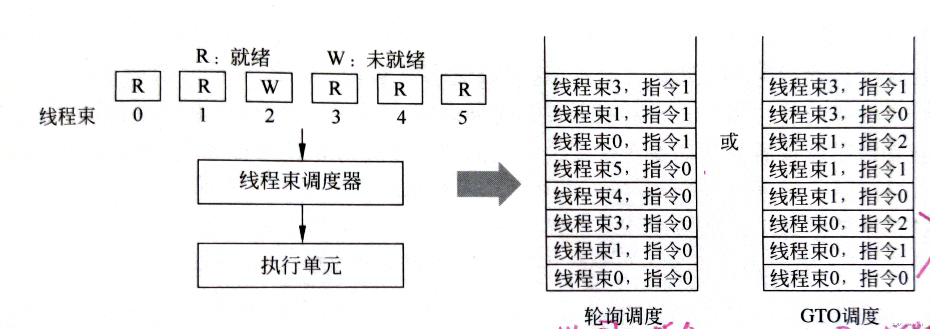 线程块被分配给一个可编程多处理器后,GPGPU会根据线程编号,将若干相邻线程组成线程束,按照锁步方式执行,所有线程进度一致,一个线程束共用一个PC,多个线程等价于多个向量操作,其向量宽度也就是线程束大小。