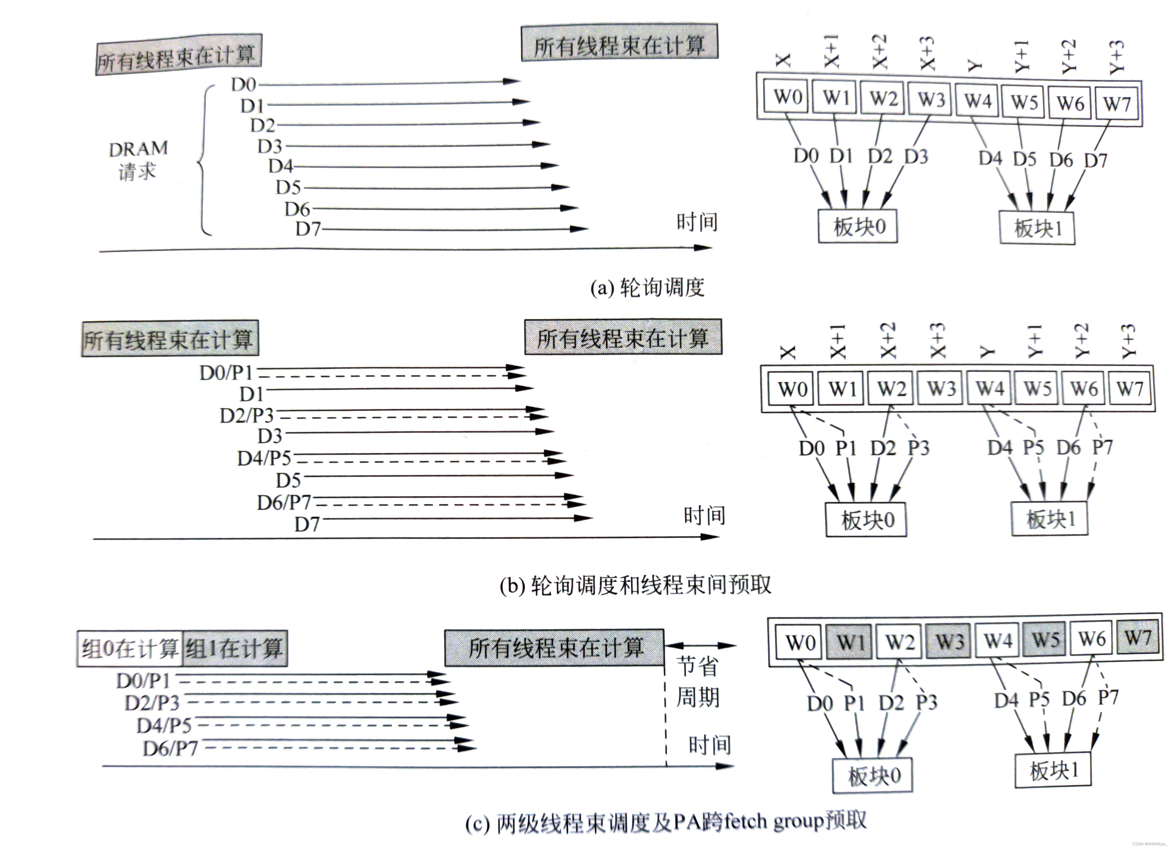 将所有线程束分成2组,第0组有较高优先级,第1组优先级次之。组内按照轮询策略依次执行,等第0组组内8个线程都执行到访存指令Ik时,将第0组优先级置为最低,给第一组最高优先级并调度执行,因此可以很好的隐藏第0组访存操作带来的长延时。