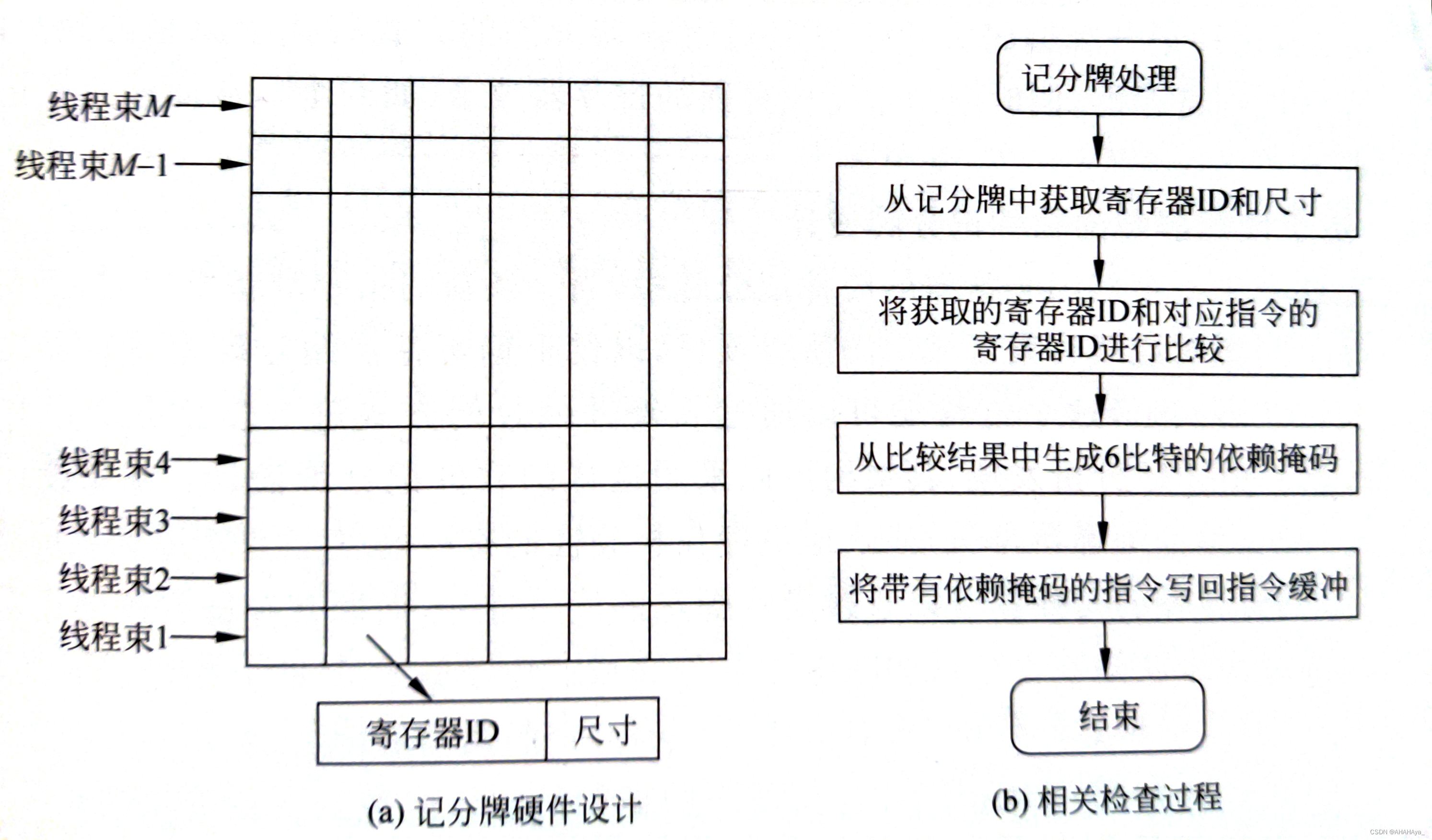 (2)所有待发射线程束指令在调度时需要一直查询记分牌,直到所依赖的指令执行完毕,更新寄存器标识位,才能发射后续指令,将带来巨大开销。
