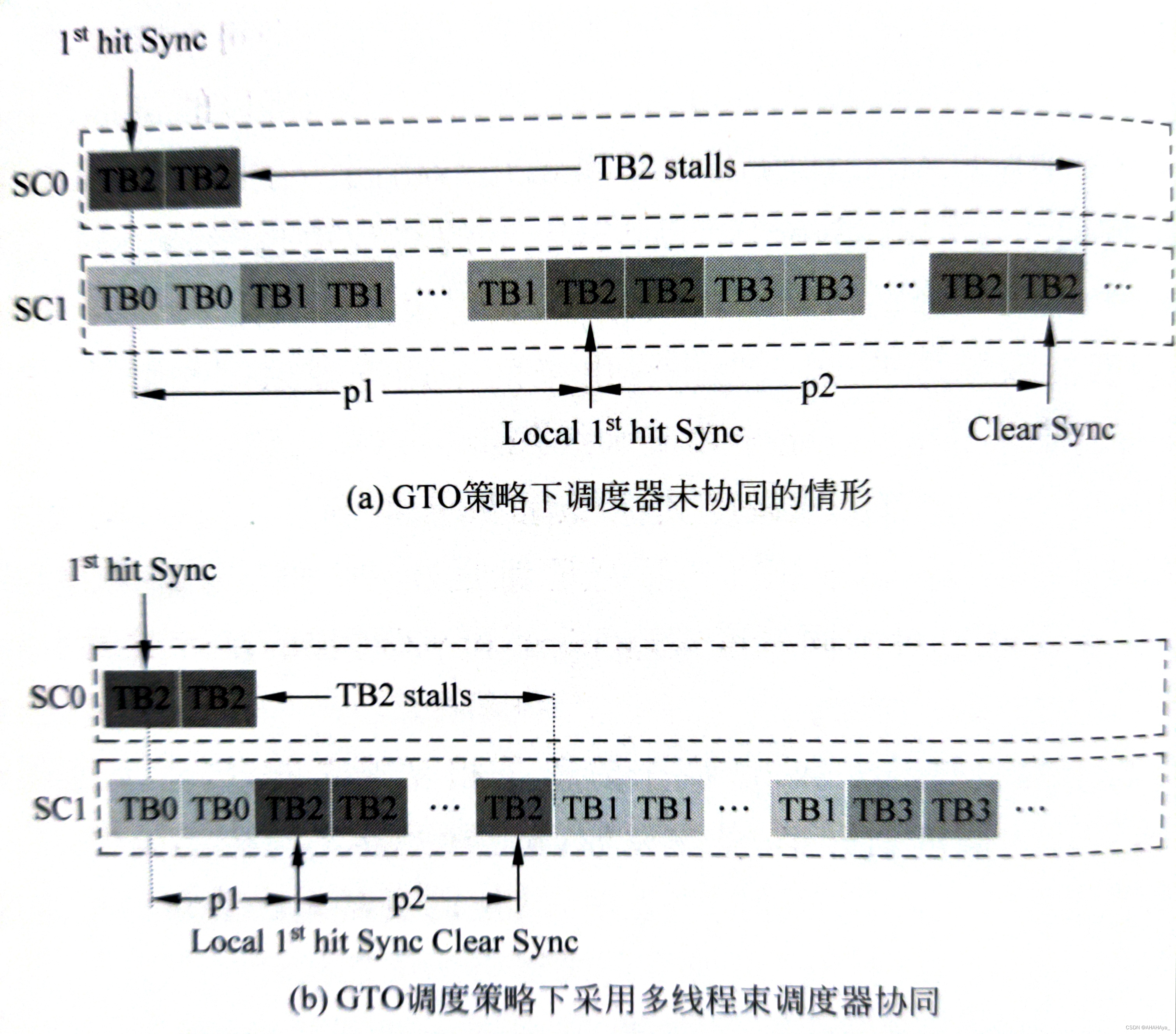 一个调度器下出现线程执行进度分化的原因:不单一线程块由于存储系统访问的不确定性,线程束的执行进度存在较大差异;线程同步栅栏处或在分支重聚处执行快的线程需要等待执行慢的线程。因此需要缩短最快和最慢之间的执行差距。