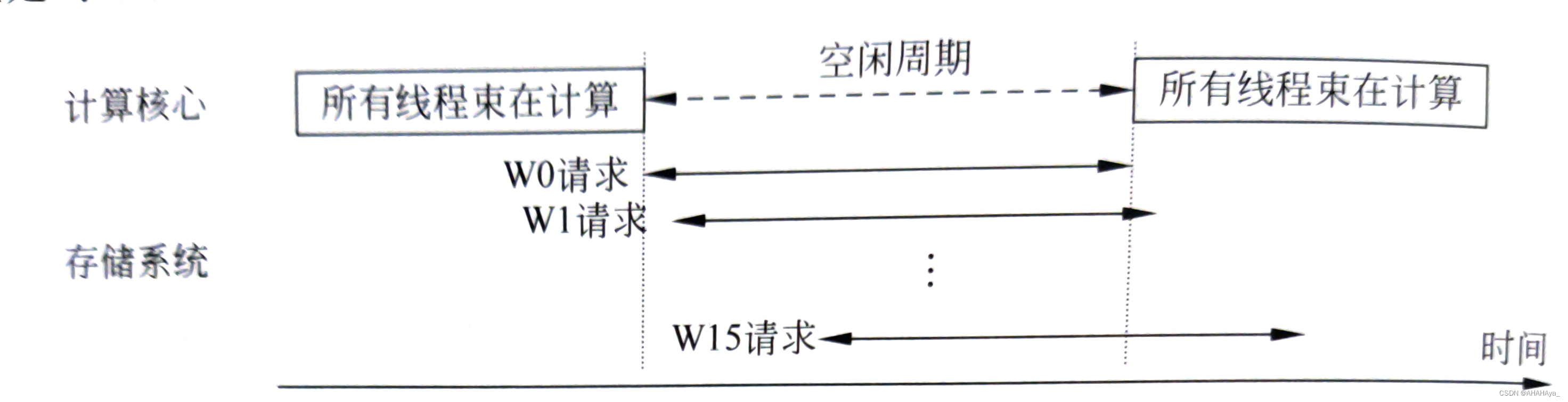 由图3使用轮询策略对16个线程束W0,W1,...,W15进行调度,每个线程束中I0~Ik-1均为运算指令,Ik为访存指令。可以看出即使相邻线程束执行Ik只差一个周期,线程束W0的访存操作几乎不可能在16个周期完成,而此时也没可以调度的线程束来隐藏访存延时。而GTO策略可以由别的线程束用于掩藏延时,但可能会破坏线程间局部性,在高速缓存很小的情况下可能会导致缓存数据重用不足甚至抖动现象,反而拉长平均访存延时。