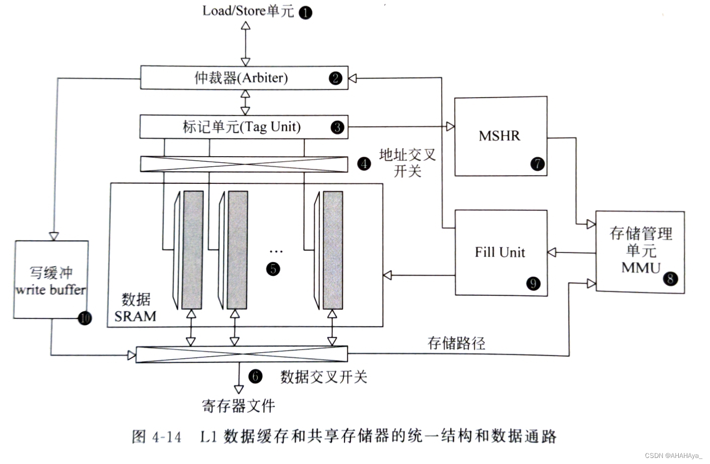图4-14中展示了L1数据缓存和共享存储器的统一结构和数据通路,其中序号5为二者共用的SRAM阵列,根据控制逻辑进行配置,可以实现一部分是数据缓存,另一部分是共享存储器的访问方式。