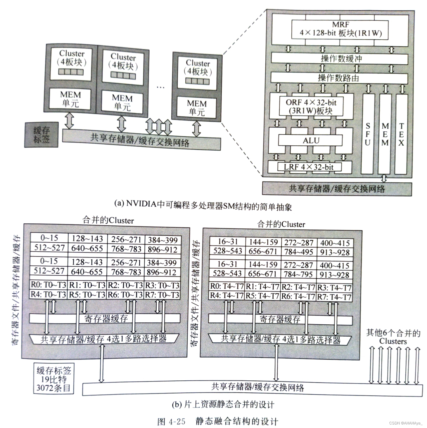 下图4-10为一个可编程多处理器修改前后微架构的对比示意图。减少对MRF的访问来减少能耗,减少对MRF带宽的要求,减少MRF板块冲突的可能性。