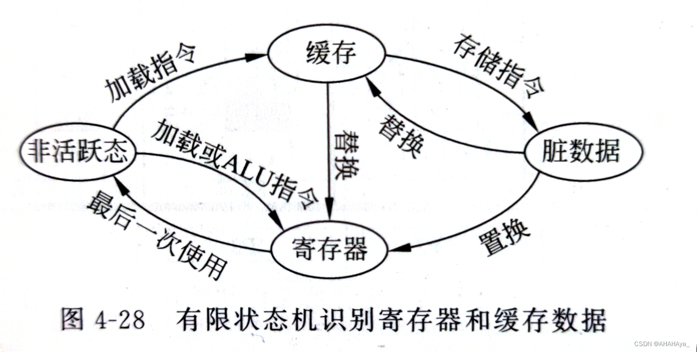 通过图4-28可以在运行过程中区分各个条目究竟是寄存器还是缓存状态,并得知寄存器是否失活而需要释放其所占用的条目,以及脏数据是否需要写回,从而实现对寄存器和缓存的全生命周期的管理。