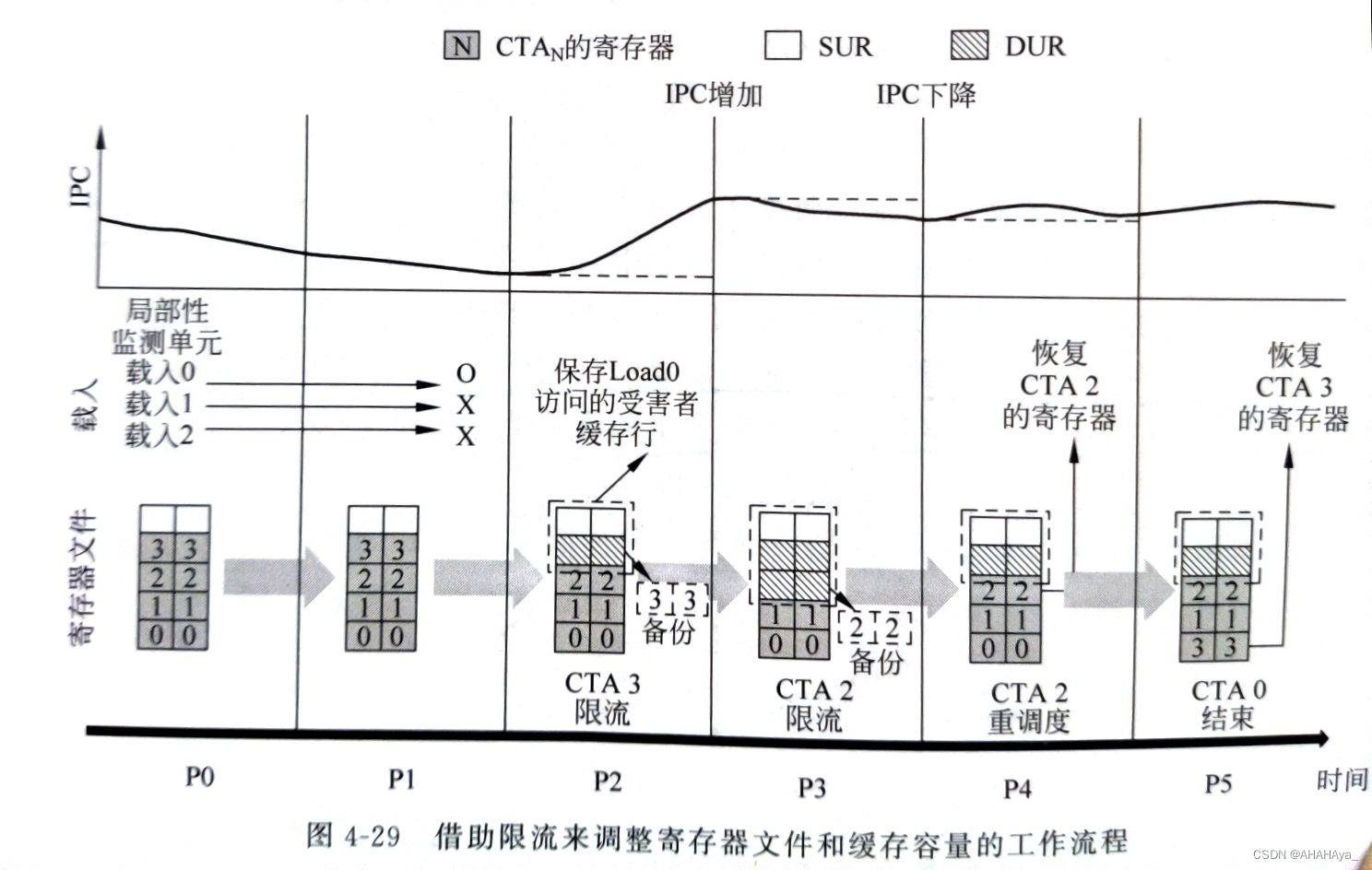 限流的工作流程如图4-29,该设计引入一个局部性监控器,它会在内核函数执行初期运行,获取各线程块内部load指令的局部性信息,识别出具有更高局部性的线程块。当找到至少一个种子线程块时,会开启限流阻塞其他线程块,并采用直接检测的方法来平衡寄存器用量和L1 cache容量,当IPC下降时,会激活一个先前被冻结的线程块。